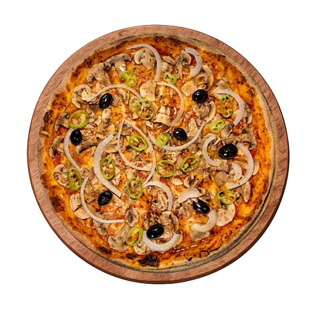 Pizza Margarita me nje shije unike me salcë domatesh dhe kaqkavallPizza vegjetariane salcë domatesh,kaqkavall, këpurdha, spec, qepë, ullinj
