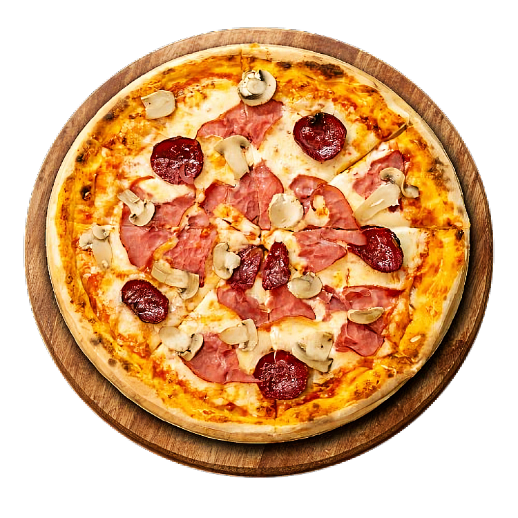 Pizza Suxhuk salcë domatesh, kaqkavall suxhukPizza Funghi salcë domatesh,kaqkavall, këpurdha te fresketa